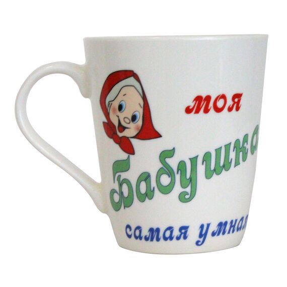 Der Becher ist aus umweltfreundlichem, hochwertigem Porzellan mit feinem Glanz gefertigt. Der Becher hat ein attraktives thematisches Design in Form eines Schriftzuges auf russisch "Meine Oma ist die Klügste".Dieser stylische Becher ist ideal für den täglichen Bedarf - ob im Büro oder Zuhause.