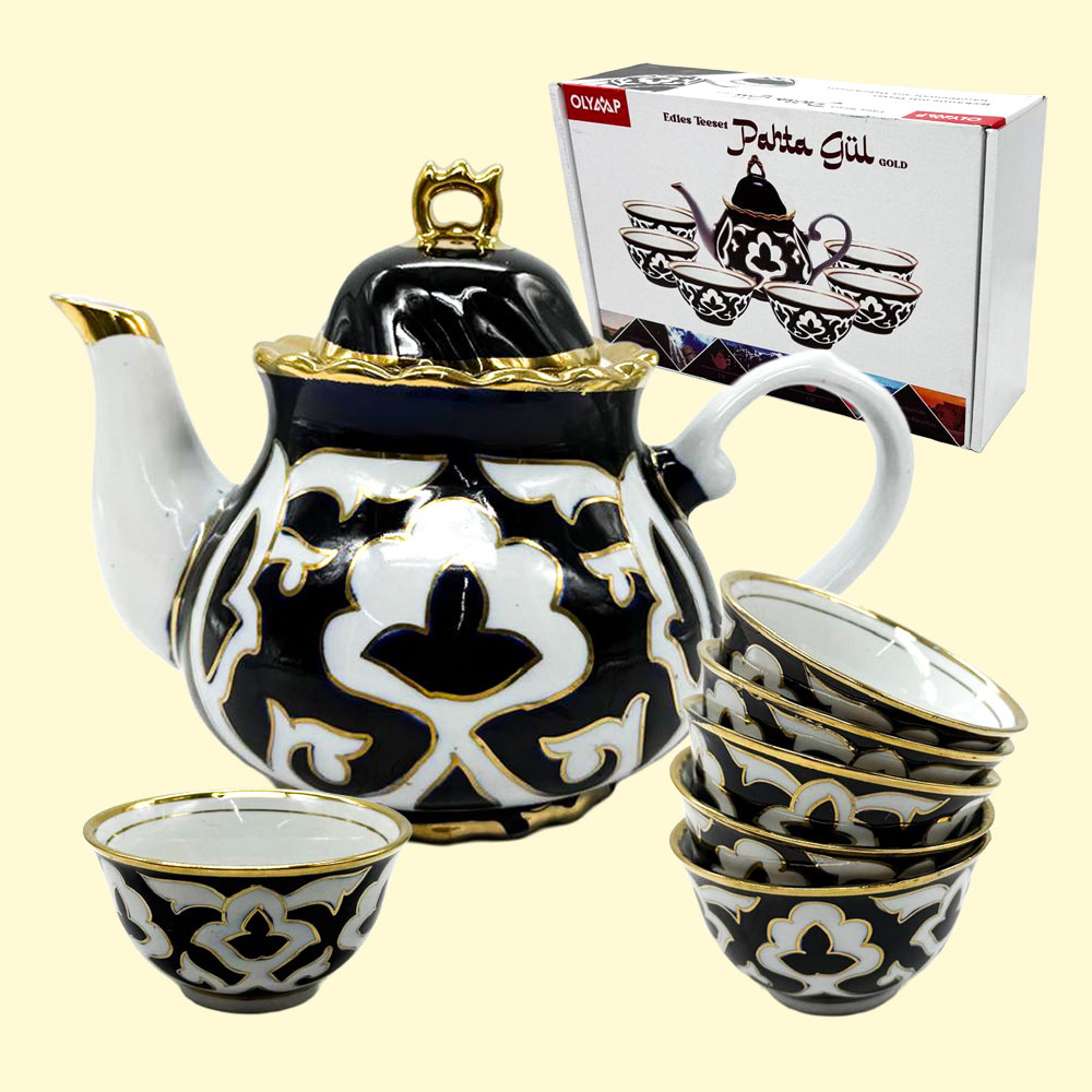 Das Set besteht aus 7 Teilen: 1 Teekanne mit 0,9 Liter Fassungsvermögen und 6 Pialas (Teeschalen).
