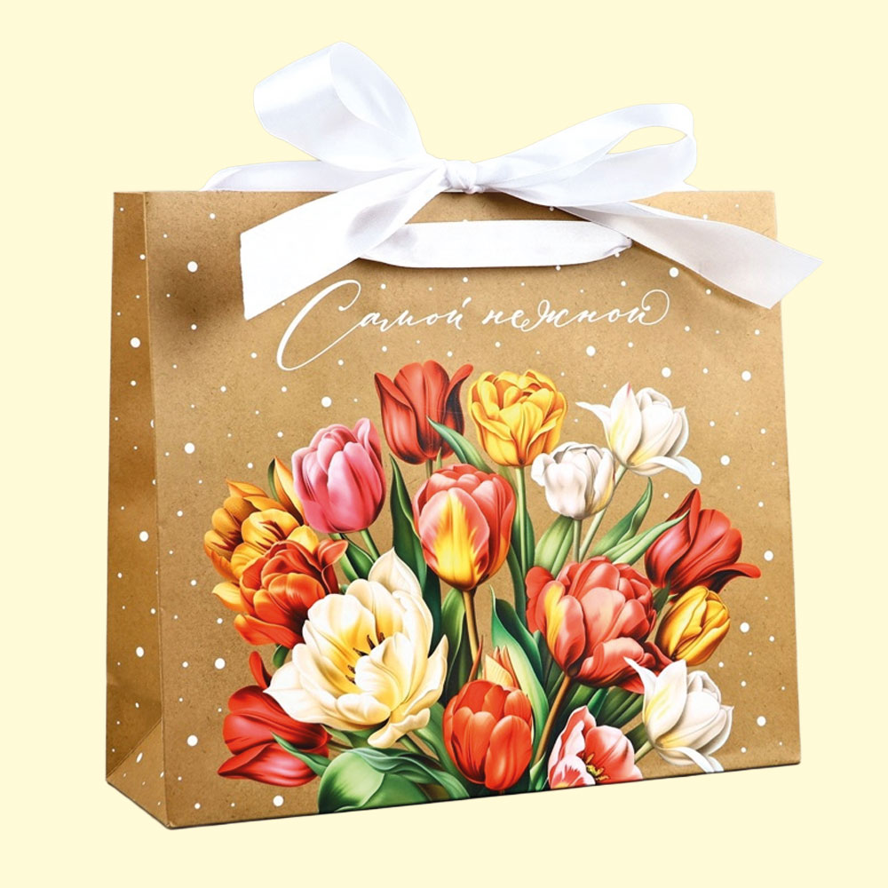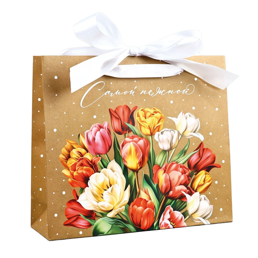 Laminierte Tasche mit Band „Für die Zarteste“, Größe 30 × 9 × 26 cm, ideal für Geschenke und Souvenirverpackungen.