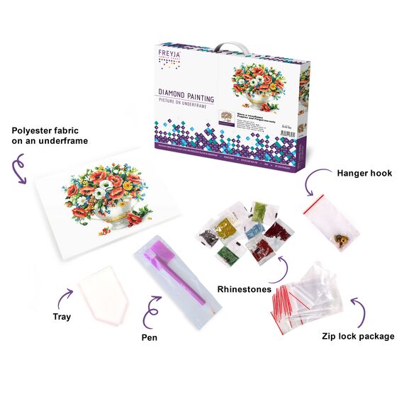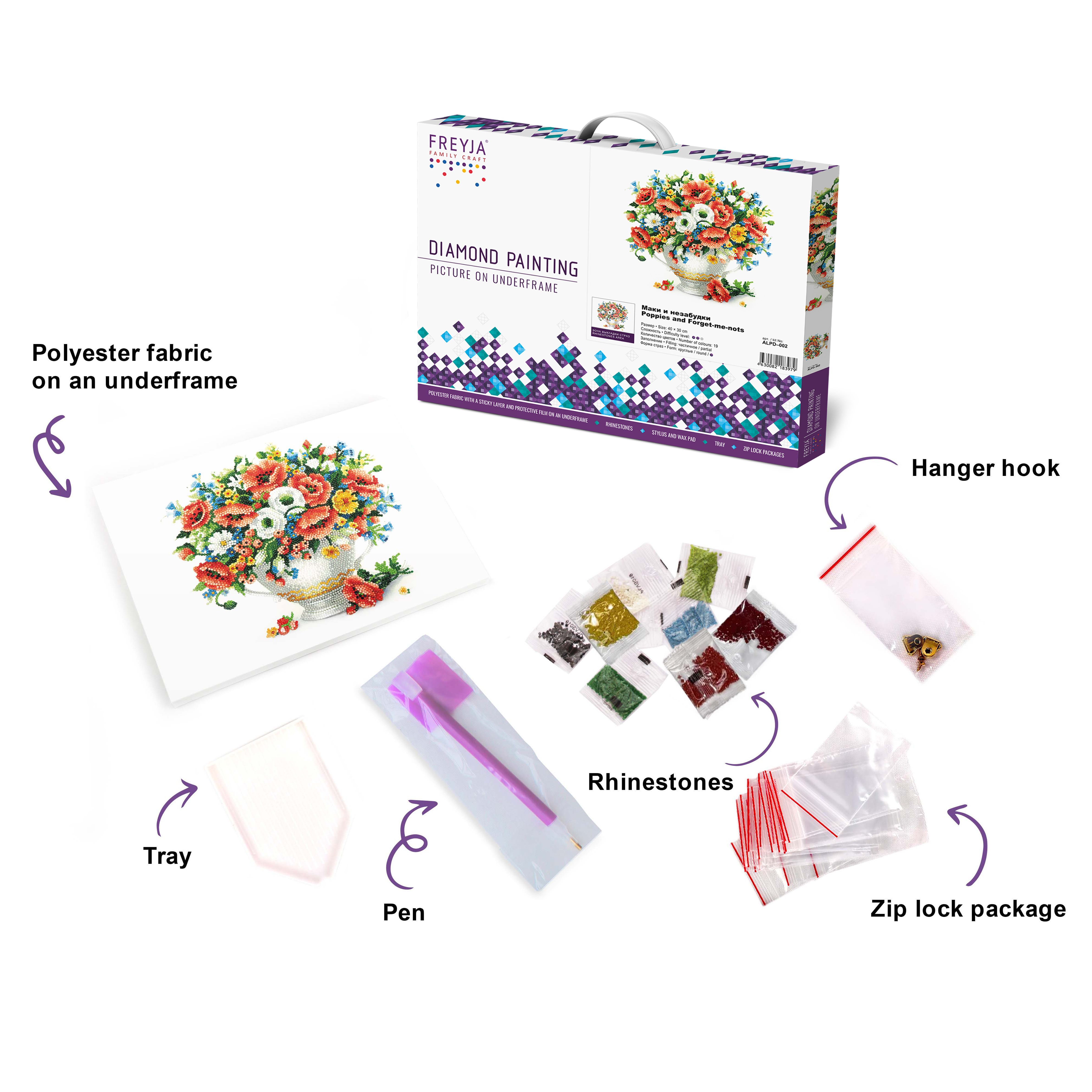 Bei diesem Set ist die Leinwand auf einen Holzrahmen gespannt, sodass Sie sie nicht zusätzlich einrahmen müssen. Das fertige Werk kann sofort an die Wand gehängt oder mithilfe der im Set enthaltenen Spezialhalterungen in ein Regal gestellt werden.