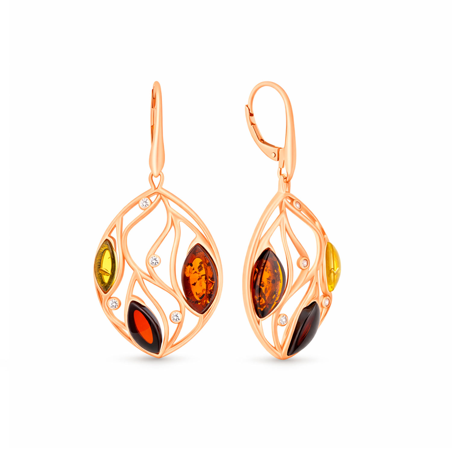 Ohrhänger rotvergoldet aus 925 Silber mit Kirschbernstein, Cognacbernstein, Zitronenbernstein und kleinen Zirkonia (Klappverschluß)